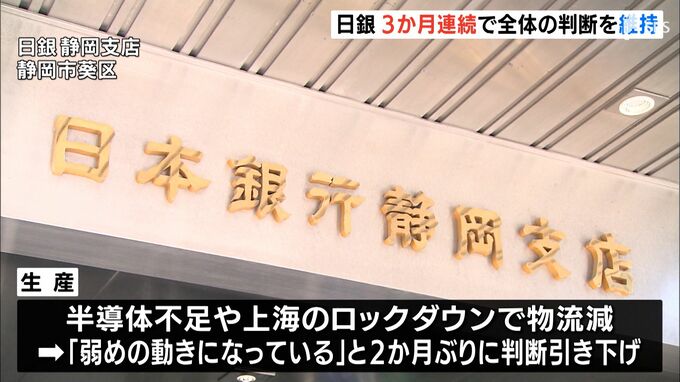 日銀静岡支店は、5月の県内の金融経済動向を発表し、「新型コロナや供給制約の影響を受けつつも基調としては持ち直している」として、3カ月連続で全体の判断を維持しました。 日銀静岡支店によりますと「生産」は…