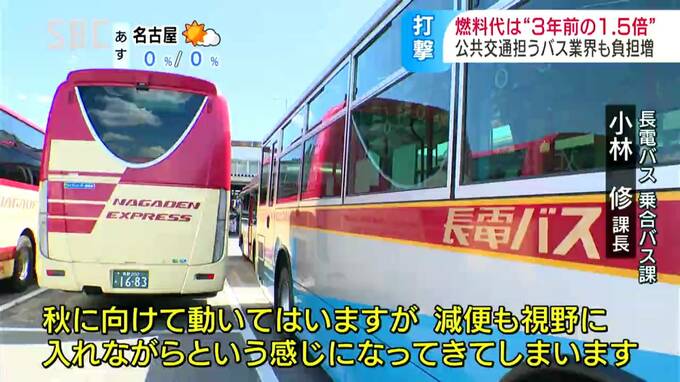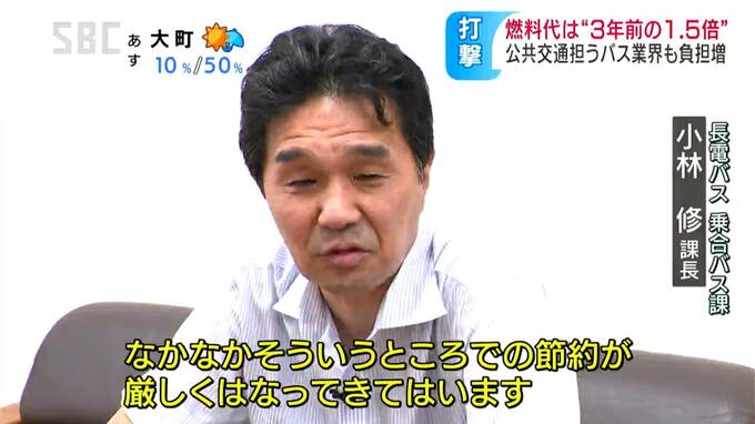 ■長電バス乗合バス課・小林修課長                                                 「乗務員にはアイドリングストップとか言ってはいますけども、この暑さの状況ですのである程度アイドリングした状態で、(冷房をかけて)お客さんを迎えるという話になりますので、なかなかそういうところでの節約が厳しくはなってきてはいます」