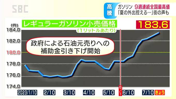2週間に1割ずつ補助金が引き下げられた結果、小売価格に転嫁されていて、県内も前の週から1円以上の大幅な値上がりとなりました。