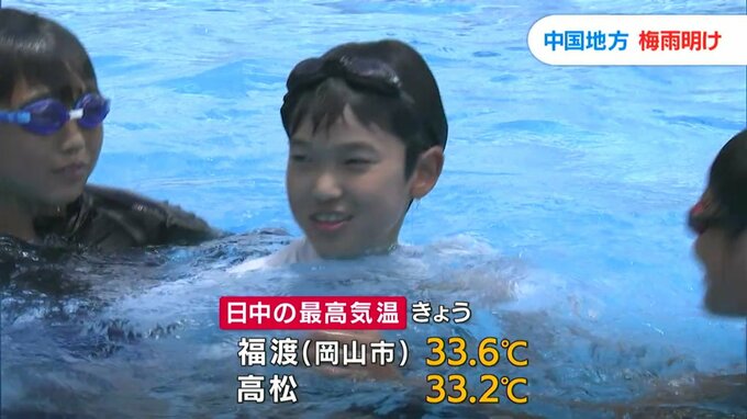 きょうの日中の最高気温は岡山市北区福渡で33.6℃、高松で33.2℃。高梁市でも33.3℃を記録し気持ちのいいプール初日となりました。