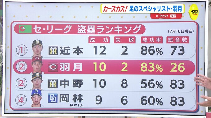 これで羽月選手は10個目の盗塁となったんです。セ・リーグの盗塁ランキング(7月16日現在)でトップの阪神の近本選手(12盗塁)まで2差。成功率も高くて、わずかにまだ2回しか失敗がなくて、近本選手(86%)並みの成功率(83%)です。