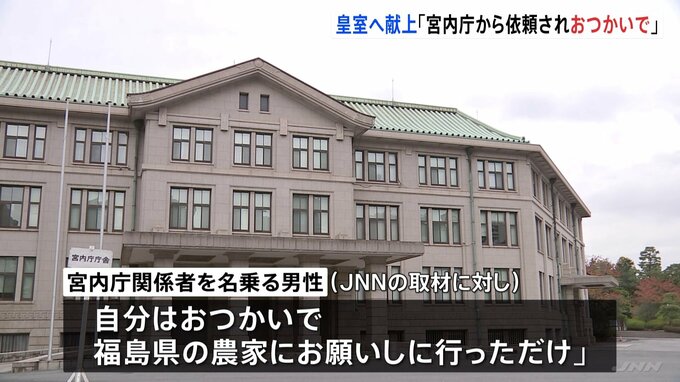 皇室へ果物などを献上するよう、各地の農家に依頼が行われている問題で、献上を持ちかけた宮内庁関係者を名乗る男性がJNNの取材に応じ、「献上は宮内庁から依頼され自分はおつかいで行った」と主張しました。この…