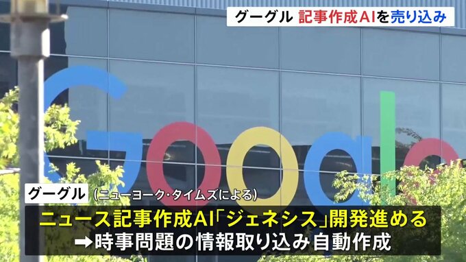 アメリカのニューヨーク・タイムズは20日までに、IT大手グーグルがニュースの記事を作成するAI=人工知能の開発を進め、複数の報道機関に売り込んでいると報じました。ニューヨーク・タイムズによりますと、開発が…