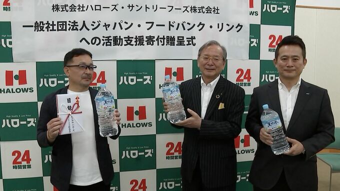 食品ロスの削減や生活困窮者を支援するフードバンク。その活動を応援しようと、スーパーマーケットなどが売り上げの一部を寄付金として贈呈しました。贈呈式ではハローズとサントリーフーズから各地のフードバンク…