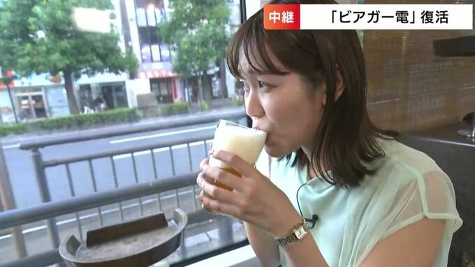 (杉澤眞優キャスター)きょう(21日)は、この路面電車の中から中継でお伝えします。この電車、ただの電車ではございません。こちらご覧ください。美味しそうな料理が並んでいます。そうなんです。電車の中で食事やお酒を楽しめる『ビアガー電』が3年半ぶりに復活するんです。きょうは一足早く関係者に向けて試運転がこのあと行われるということで、お邪魔しております。