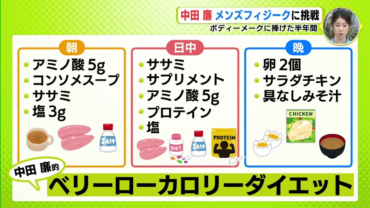 「減量は2か月半前から。『ローファットダイエット』といって、脂質を抑えて、炭水化物・タンパク質を多くとる食事をやりながら、その次、『ケトジェニックダイエット』という脂をとって、からだの体脂肪をエネルギーとして燃焼する。今が、ちょっと『VLcD』っていう『ベリーローカロリーダイエット』っていうんですけど、カロリーを極力低く、今も700キロカロリーしか接種していなくて…」