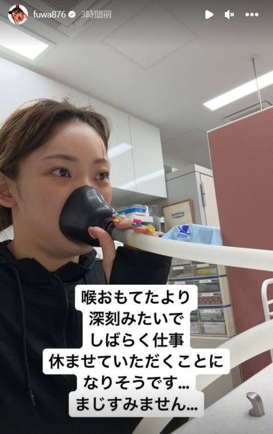 さらに、神妙な面持ちで吸入器を口鼻に当てている写真と共に「喉おもてたより深刻みたいで しばらく仕事休ませていただくことになりそうです…まじすみません…」とのテキストを添えています。