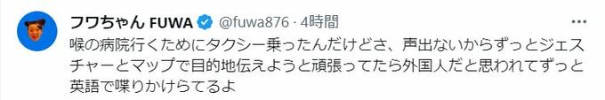 ツイッターでは「喉の病院行くためにタクシー乗ったんだけどさ、声出ないからずっとジェスチャーとマップで目的地伝えようと頑張ってたら外国人だと思われてずっと英語で喋りかけらてるよ」(原文ママ)と、大変さが偲ばれるような文章を投稿しています。