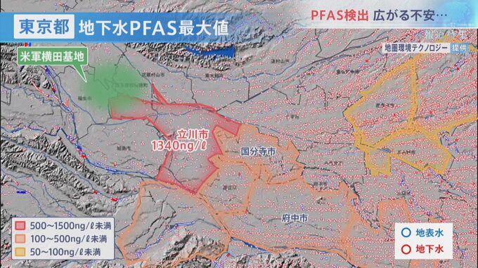 地下水の流れのシミュレーションでは、横田基地が位置する上流から南東の立川市や国分寺市、府中市などへ水が流れている。都の調べで基準値を超えるPFASが検出された地域と重なる。