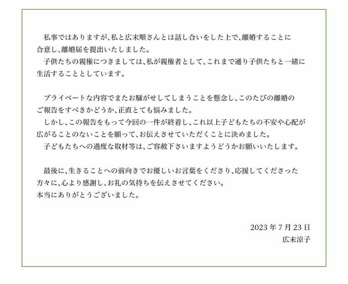 私事ではありますが、 私と広末順さんとは話し合いをした上で、離婚することに合意し、離婚届を提出いたしました。