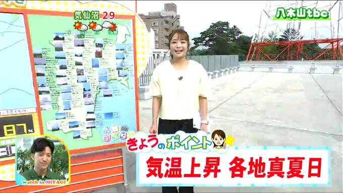 7月24日月曜日、宮城の30秒天気です。tbc気象台、南真央気象予報士がお伝えします。「きょうは太平洋高気圧に覆われてよく晴れ、内陸を中心に最高気温30度以上の真夏日となる見込みです。熱中症・紫外線への対策…