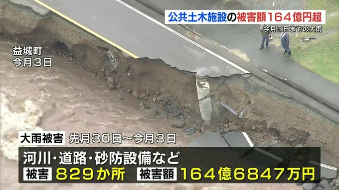熊本県は6月30日から7月3日までに降った大雨によって、河川や道路、砂防設備など、県内の公共土木施設への被害が829か所で確認され、被害額が164億6847万円に上る見込みだと発表しました。