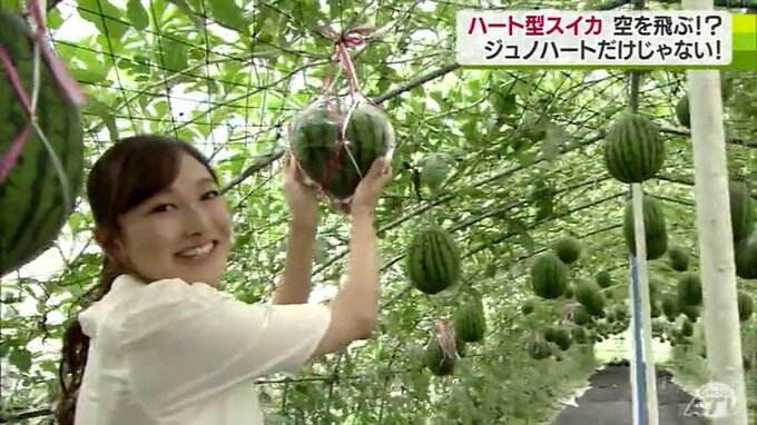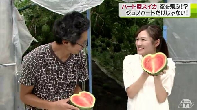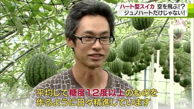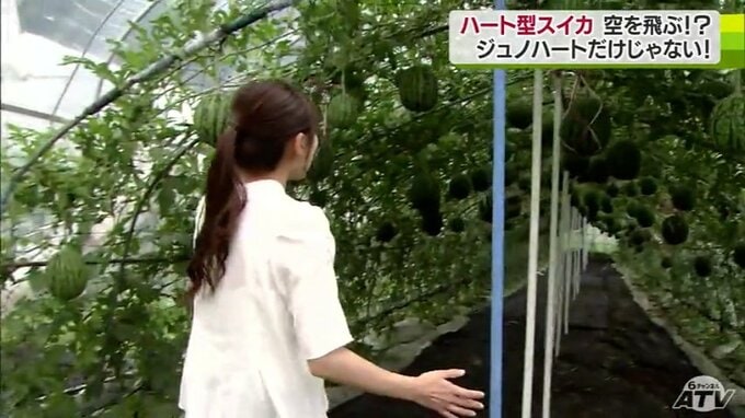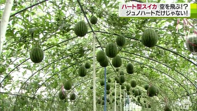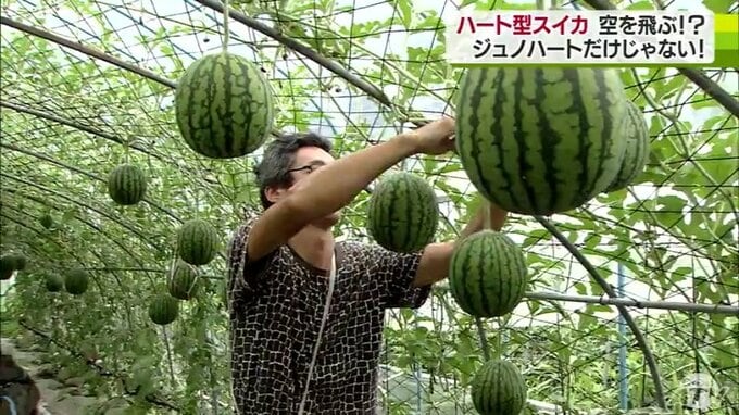 夏の味覚のひとつ、スイカ。青森県南部町のビニールハウスで栽培されているスイカですが、ハートのかたちをしています。栽培方法も通常とは異なっていて、スイカが空を「飛んで」います。取材してきました。