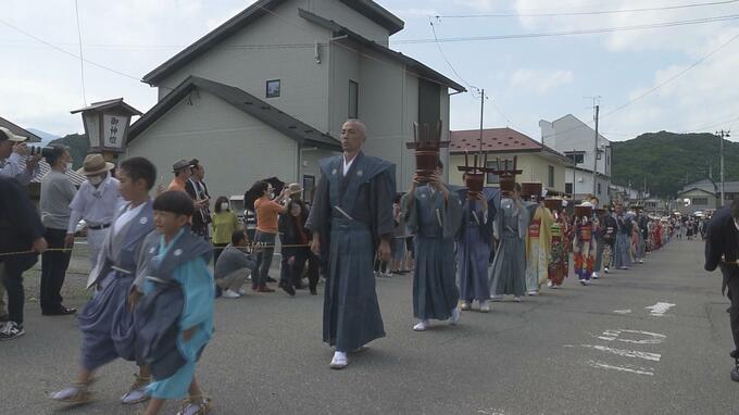 4年ぶりに通常開催となった今年は、祭りのメインともいえる「七行器行列」が行われ、花嫁姿の女性など60人が神前に供える酒と赤飯、それに魚を持って神社までの道のりを練り歩きました。
