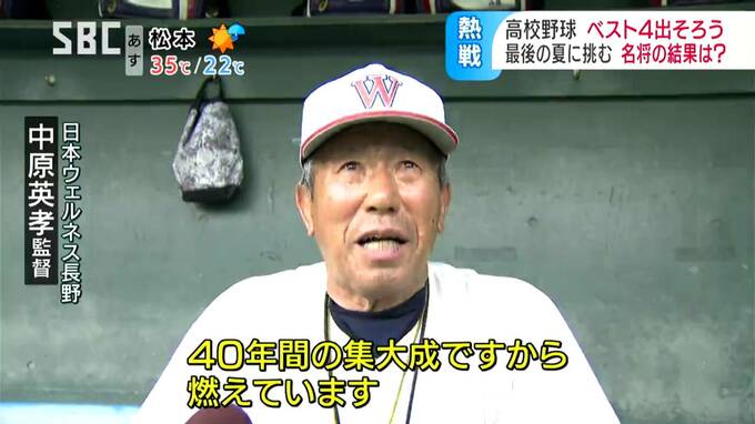 甲子園春夏あわせて11回の出場で14勝をあげ、この夏で勇退を表明している名監督が率いる日本ウェルネス長野も初のベスト4入りに挑みました。