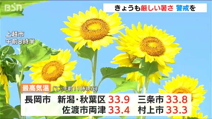 25日の県内は午前中から気温が上昇していて午前11時現在の最高気温は長岡と新潟市秋葉区で33.9℃、三条で33.8℃など県内28の観測地のうち全ての地点ですでに30℃以上の真夏日となっています。