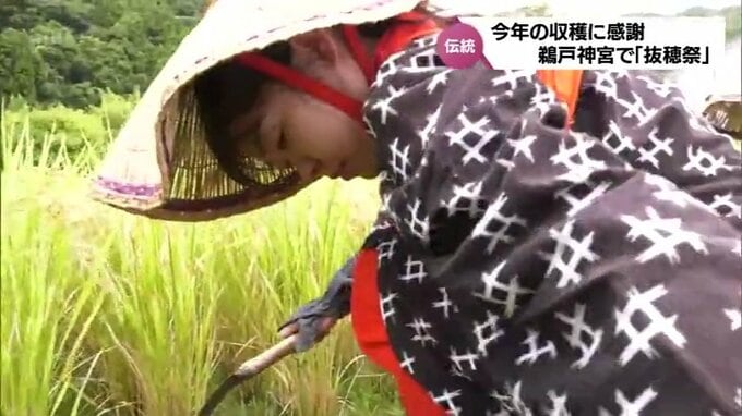宮崎県日南市の鵜戸神宮では、今年のコメの収穫に感謝する伝統神事の「抜穂祭」が行われました。抜穂祭には、稲を刈る刈女姿に扮したJAの女性職員や、地元の小中学生らあわせておよそ50人が参加しました。(稲刈り…