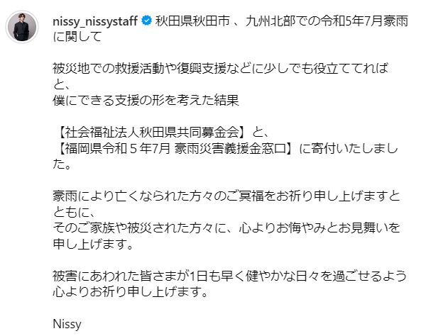 25日、Nissy(西島隆弘)さんが自身のインスタグラムとストーリーズを更新し、今月の豪雨被災地の復興のために、秋田県と福岡県にそれぞれ1000万円・合計で2000万円の寄付をしたことを明かしました。