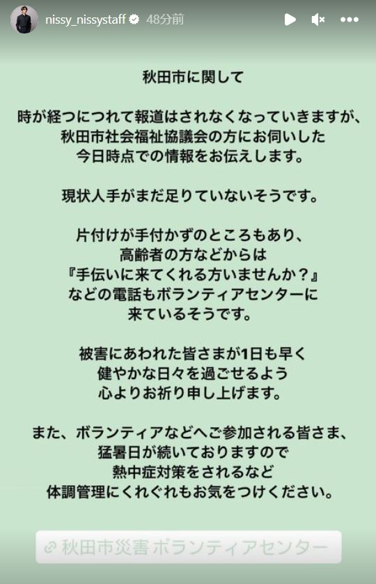またストーリーズでは上記の投稿に続いて、秋田市の復興ボランティアについて言及。「時が経つにつれて報道はされなくなっていきますが」と書き出し、「秋田市社会福祉協議会の方にお伺いした今日時点での情報をお伝えします。現状人手がまだ足りていないそうです」と厳しい現状を伝えています。合わせて「ボランティアなどへご参加される皆さま、猛暑日が続いておりますので熱中症対策をされるなど体調管理にくれぐれもお気をつけください」と呼びかけ、「秋田市災害ボランティアセンター」へのリンクを掲載しています。