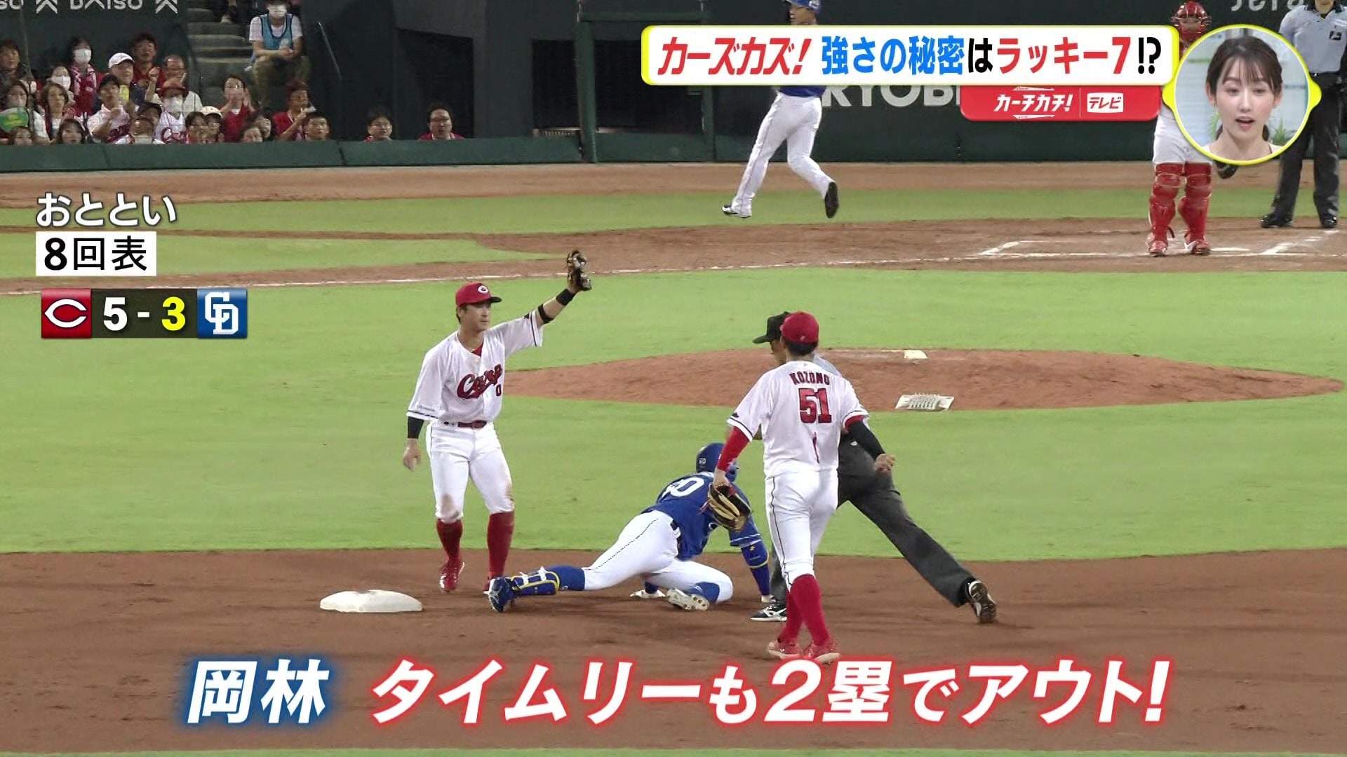 23日(日)にも 大瀬良大地 投手が、2点差の場面でタイムリーを打たれて1点差になるんですけれども、1塁ランナーが2塁を飛び出したところでタッチアウト。複数失点のリスクを軽減しているということもあって、まず守り・ディフェンス面でずっとビッグイニングを作られていないっていうところがあるんですね。