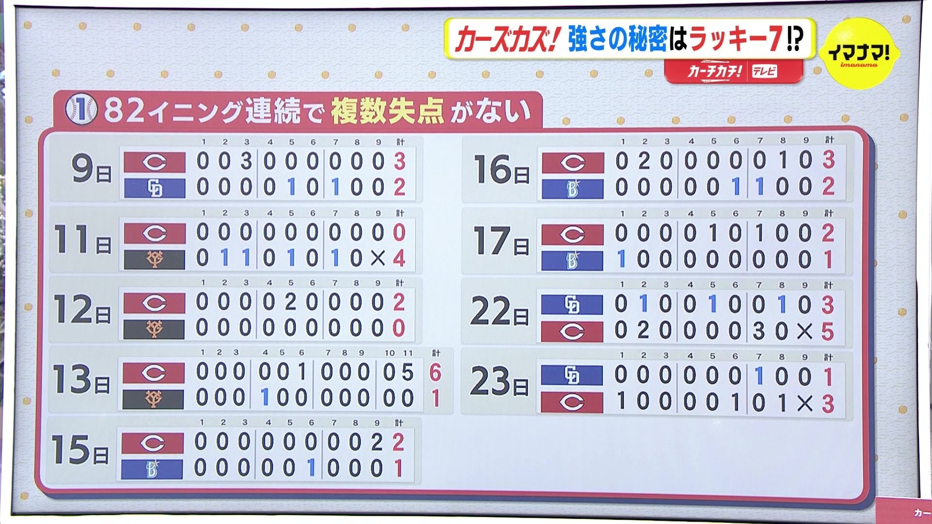 まず、82イニング連続であることがないんです。ここ9試合の得点を並べてみました。何がないんでしょうか?