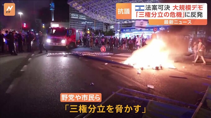 イスラエルでは24日、最高裁の権限を弱める内容を含む法案が国会で可決されました。現地では三権分立を脅かすとして大規模な抗議活動が行われています。高圧放水でデモ隊を制圧しようとするイスラエルの警察。24日…