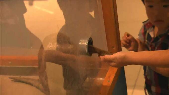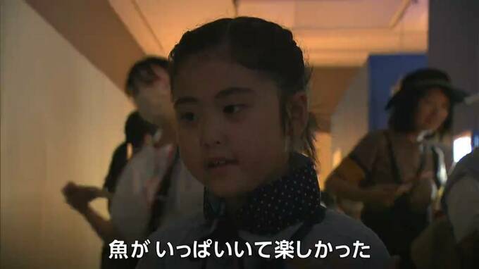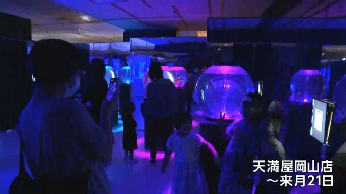 夜の海をイメージした空間で生き物たちを観賞できる水族園が岡山市北区の天満屋岡山店で始まり、夏休みを迎えた子どもたちで賑わっています。