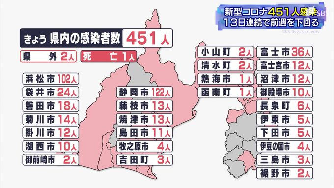 静岡県内では6月4日、新たに451人が新型コロナウイルスに感染したことが分かりました。1日あたりの新規感染者数は13日連続で前の週を下回っています。感染者を自治体別にみますと静岡市122人、浜松市102人、富士市3…