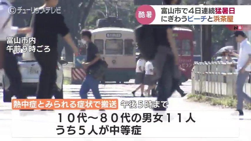 チューリップテレビが県内の各消防に問い合わせたところ午後5時までに10代から80代の男女11人が熱中症とみられる症状で病院に搬送されていてうち5人が中等症となっています。