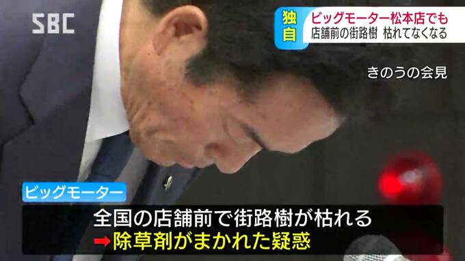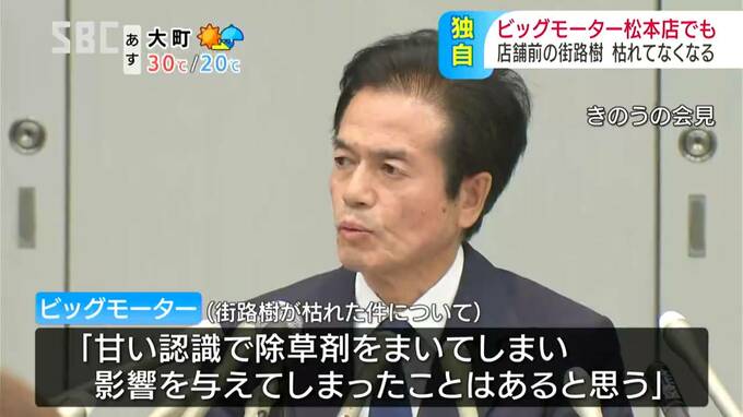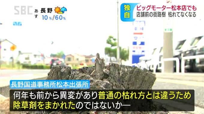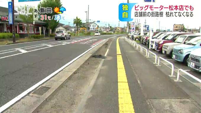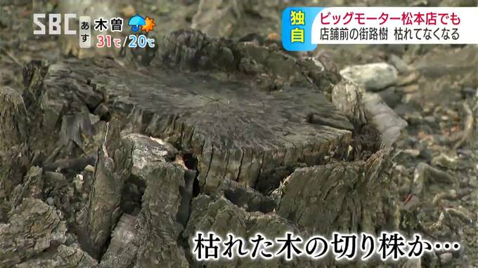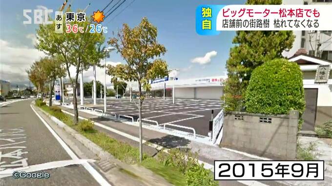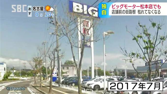 中古車販売大手・ビッグモーターでは、全国の複数の店舗の前で街路樹が枯れているのが見つかっていますが、松本市の店の前の街路樹も、枯れてなくなっていることがわかりました。