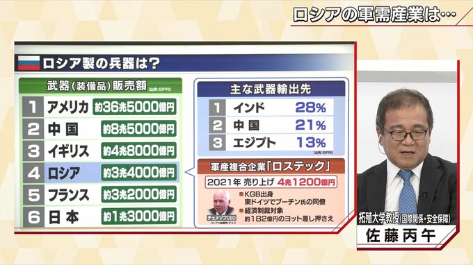 「活況を見せるNATOの軍需産業の裏返しです。ロシアの兵器システムに対する信頼感が徐々に失われていくと思います。(中略)アメリカの武器の売り方は、“ネットワークで戦争を戦う”という文脈の中で同盟国に武器を売っていくというシステム。ロシアは今回分かったように友達というか友好国がいないわけですから市場が限られる。技術面でも政治面でも軍需産業は苦労するでしょう」