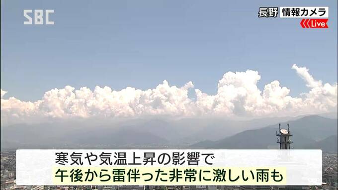 気象台によりますと、上空の寒気や気温が上がる影響で、長野県内は27日の午後から大気の状態が非常に不安定になることから、雷を伴った非常に激しい雨が降るところがありそうです。