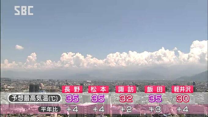 気温も各地で上がって、予想最高気温は長野、松本、飯田で35度と、猛暑日になりそうです。