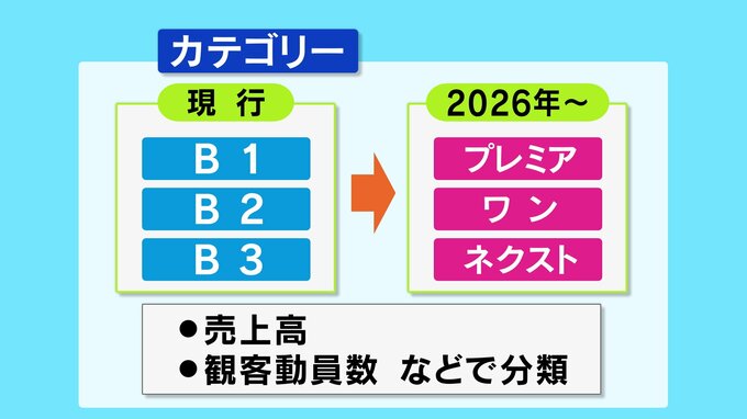 現在は「B1・B2・B3」の3つのカテゴリーに分かれていますが、これが「プレミア」「ワン」「ネクスト」の3つとなり、成績ではなく『チームの売上高』や『観客動員数』などで分類されます。