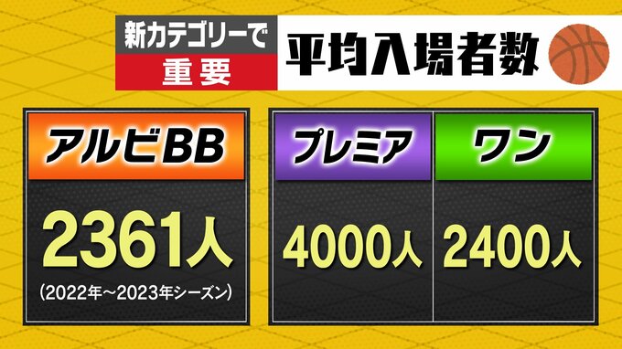 アルビBBは、まずはB1を目指すことになりますが、2026年以降どうなりそうかというと、直近シーズンの平均入場者数は「2361人」で新カテゴリーでは「プレミア」(4000人)どころか「ワン」(2400人)の基準も満たしていません。B1を目指すとともにブースターを増やす取り組みが求められます。