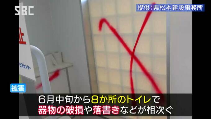 松本市と塩尻市にまたがる信州スカイパークのトイレで、落書きや家庭ごみを捨てるなどの被害が相次いでいて、県は警察に被害届けを出すなど対応に苦慮しています。