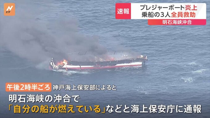 神戸海上保安部によりますと、午後2時半ごろ、明石海峡の沖合で「自分の船が燃えている」などと海上保安庁に通報がありました。明石海峡大橋の西側の沖合でプレジャーボートから出火していて、午後3時半ごろから、…