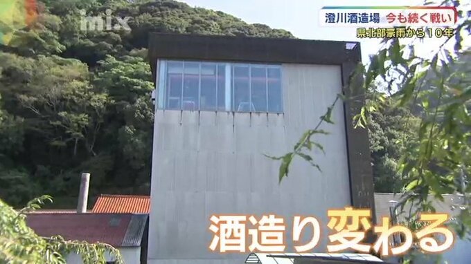 澄川さんはすぐに出張先から帰国。幸い家族は無事でしたが、蔵の一帯は濁流の跡で茶色く染まり、酒造りの設備も壊滅状態になりました。10年がたって、ここにも、被害の跡はほとんどありません。唯一残っているのは…