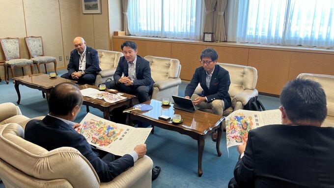 NTT東日本青森支店の磯﨑 崇支店長は28日、青森テレビを訪れ、「NTTグループねぶた」として8月2日から開幕する青森ねぶた祭に出陣する大型ねぶた「釈迦降誕」について青森テレビの小山内 悟社長に説明をしました。「釈迦降誕」は「SDGs」をテーマに掲げ、ねぶた師の北村春一さんが制作した大型ねぶたで、SDGsの目標12の「つくる責任つかう責任」を達成しようと、去年出陣したねぶたの廃材を材料として再利用しています。