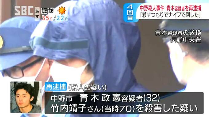 殺人の疑いで再逮捕されたのは中野市江部(えべ)の農業青木政憲(あおき・まさのり)容疑者32歳で、近くに住む竹内靖子(たけうち・やすこ)さん・当時70歳を殺害した疑いです。