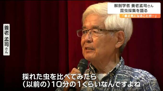 養老さんは、昆虫採集の愛好家としても知られていて、28日は、幼少時代の思い出や虫の生態の変化などについて講演しました。