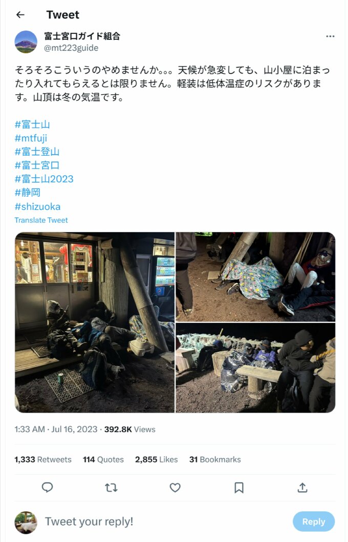 「今回の投稿は増加し続ける弾丸登山者に対する、怒りを通り越して、呆れ果ててしまった気持ちと、それでもまだ残っている心配の気持ちからです。富士登山関係者はみな、わたしと同じような気持ちではないでしょうか。わたしたち登山ガイドに彼らを止める権限はありませんが、事故が起きないように、継続的に啓発したいという願いを込めました」