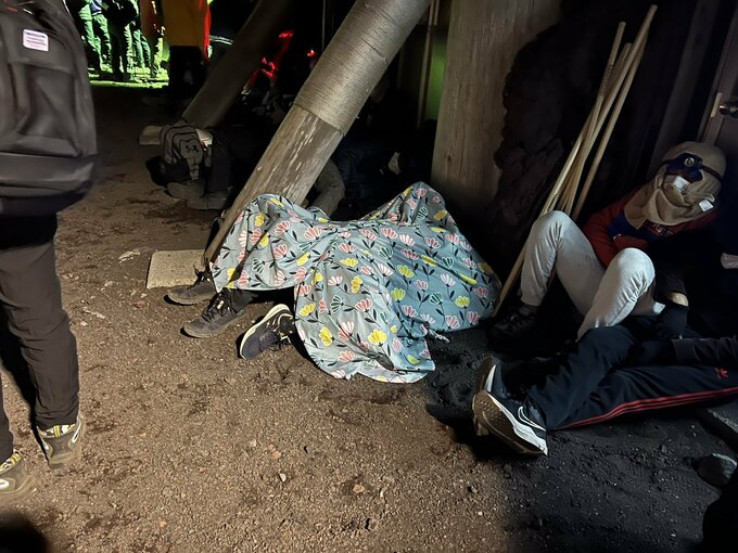 投稿には、山小屋の玄関口や周辺に座り込む弾丸登山者らの写真が数枚添えられています。足元はスニーカー、ジャージーやスエットという服装の彼らは5~6℃にまで下がった富士山の夜を背中を丸めて耐えています。