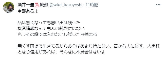 また、思い出の品や、機密情報、自宅の鍵などが入っていなかったか尋ねられると、酒井さんは「全部あるよ」と回答し「品は無くなっても思い出は残った 機密情報なんてもんは純烈にはない もうその鍵では入れないし試したら捕まる 無くす前提で生きてるからお金はあまり持たない、昔から人に渡す、大黒柱となり信用があれば、そんなに不具合はないよ」と、前向きにコメントしました。