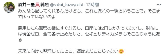 そして、酒井さんのリュックが見つからないことを気遣う、SNS上のファンの声に対し「みんな心配してくれるんだけども、これも流れの一環ということで。そこまで困ってはないのよ」と返答し「悪用したら警察の話にすぐなるし、口座には2円しか入ってないし、財布には現金ゼロ、全て各所止めたしさ、セキュリティカメラもそこらじゅうにある」と綴りました。