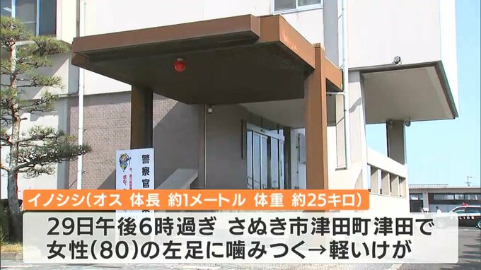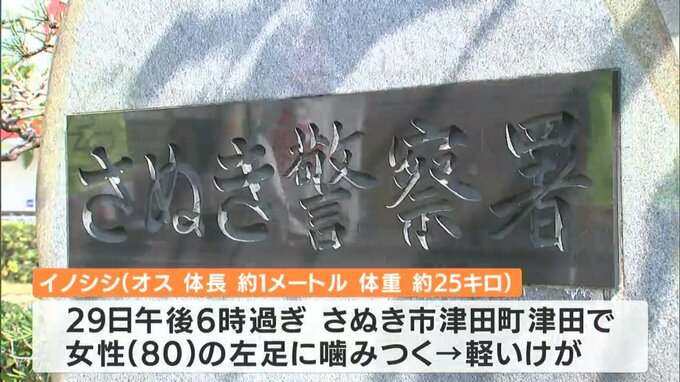 きのう(29日)午後6時過ぎ、さぬき市津田町津田で、体長約1メートル、体重約25キロのオスのイノシシが、水やりをしていた80歳の女性の左足にかみつき、そのまま逃げました。女性は軽いけがをしました。
