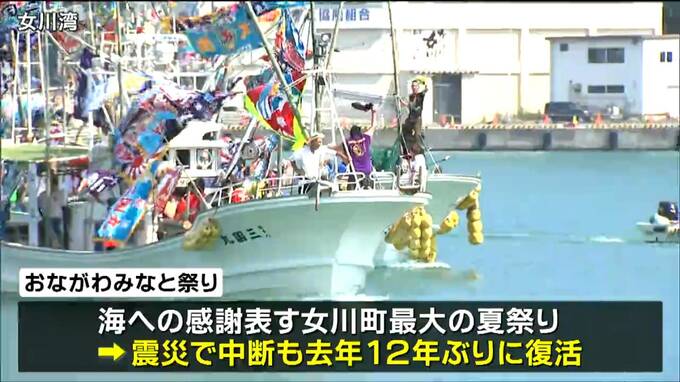 「おながわみなと祭り」は、海への感謝を表す女川町最大の夏祭りで、東日本大震災後に中断していましたが去年、12年ぶりに復活しました。目玉は、女川湾で行われた「海上獅子舞」です。町内8つの団体が出演し、岸壁沿いをゆっくりと進む船の上で勇壮な舞いを披露しました。
