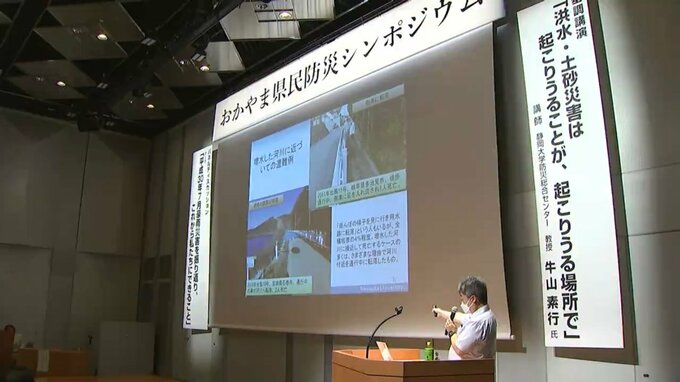 シンポジウムは岡山県と山陽新聞社が開いたもので、静岡大学防災総合センターの牛山素行教授が基調講演を行いました。