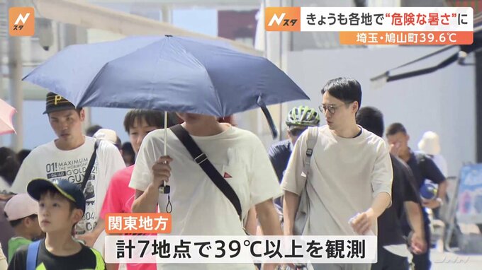 きょうも広い範囲で気温が上がり、埼玉県鳩山の39.6度をはじめ、関東地方で40度に迫る危険な暑さとなりました。きょうも各地で朝から気温が上がり、埼玉県の鳩山では午後2時前に全国で最も高い39.6度を観測しまし…