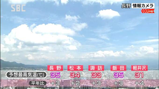 一方、31日は長野と飯田で最高気温が35度の猛暑日に、その他の地域も最高気温が30度以上の真夏日になる見込みで、引き続き熱中症に注意が必要です。